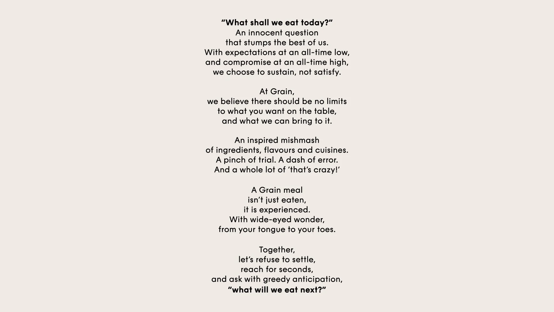 Grain was determined to meet in the middle with an experimental and wholesome approach that would shake things up. The brand wanted to create meaningful food experiences where food had no limits, and left customers reaching for seconds and asking “what will we eat next?”
